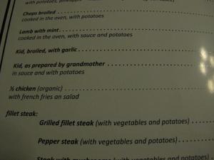 Arriving in Yaiza, we were happy to find an enormous town festival with rides and live music and asked around for a local restaurant. “La Era” was recommended and a bit of a tourist destination. Still the servers were kind, the local fare delicious and the atmosphere divine. We drank local wine and ate Canarian fish stew with Pappas con Mojo. “Mojo” is a sauce usually made with garlic, parsley and pepper and such. They have green “Mojo” and red “Mojo” it can come spicy or mild, it seems that each restaurant has its own “mojo” and served with potatoes is delicious and vegetarian! Check out my menu and the english translation it is hysterical!
