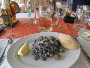 The next day we took a drive around the entire island. Our first stop was Playa Blanca which lies on the southern tip of the island and is a German enclave. There are more street signs in German here than in Spanish! The port side of town is dotted with restaurants and shops and beaches dotted with sun worshipers… the air is cool and the sun is hot. It is september and tourism decreased for back to school. Still The Canary Islands enjoy a year round tourist industry… We found a restaurant that served us the most delicious squid ink paella!