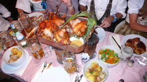 The table reservations are staggered and each reservation has about 5 hours to celebrate, then a clean up crew turns around a section in about 20 minutes. The first reservations are at 11 am and the fair is open until midnight. The servers here that work Weisn and can make a ton of money – up to $30K in one season! But the work is grueling and the days are long. The mugs of beer they carry are extremely heavy but the more they carry the more they sell. Many of the waitresses wear wrist guards and orthopedic shoes to support the heavy load. They have to deal with the demanding, thirsty, hungry drunks and do it with a combination of warmth and toughness and they do it in their dirndls. It is really an art form. Some of them have whistles and blow them while carrying the beer or trays of food to move people out of the way, some of them just yell. Our waitress was Juanita from Serbia, she handled about 75 people in her section.
