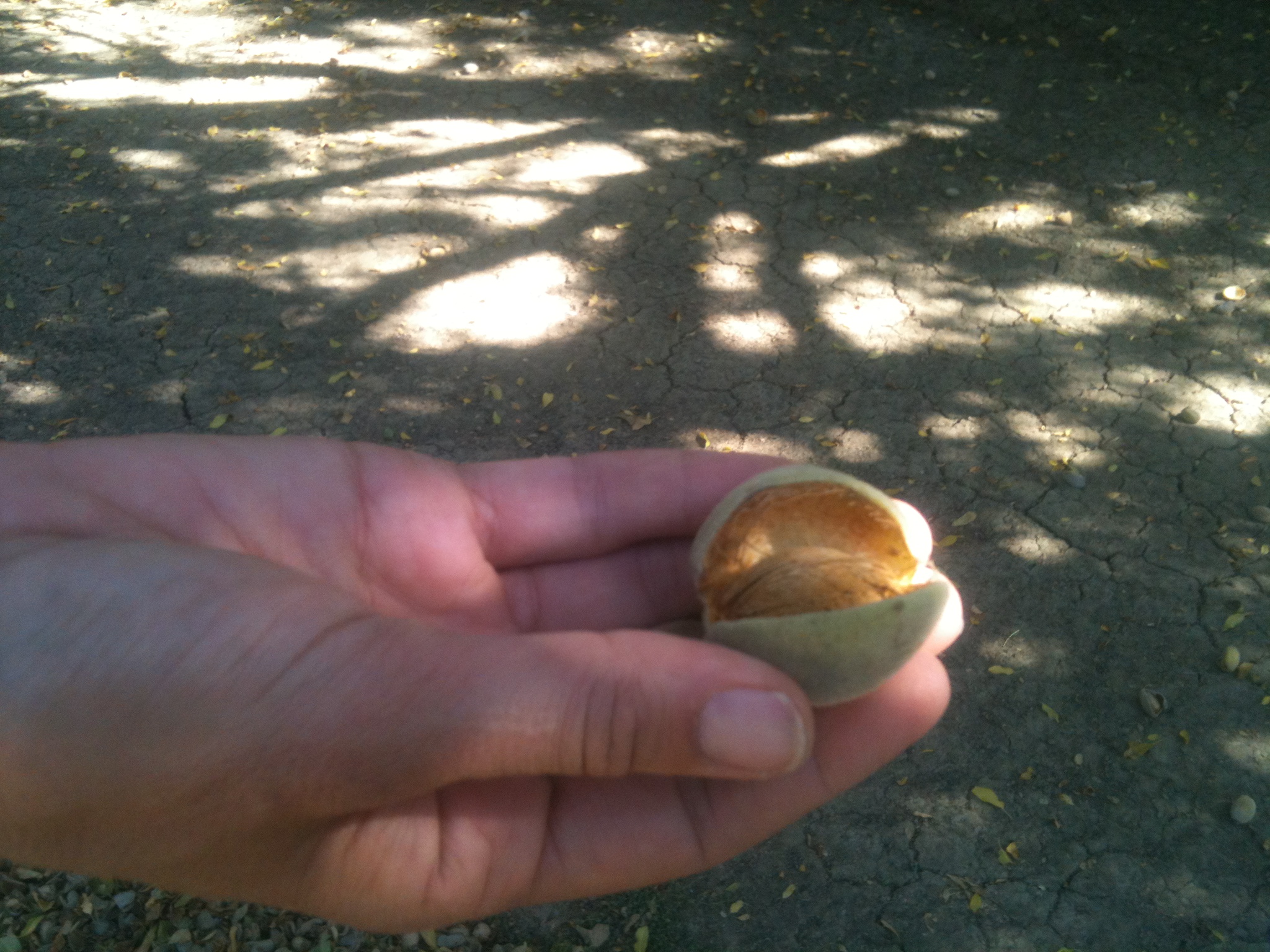 Since we are here around harvest, you can only imagine that it is peak time to pull an almond fruit off the tree and bite into it! You pull the soft fruit off the tree and split open the fuzzy hull. Then you bite into the shell of the almond is actually soft and easy to open. After you crack the shell – revealed is the dark brown nut. One bite into it and you immediately taste marzipan. By far the best almond I have ever had…