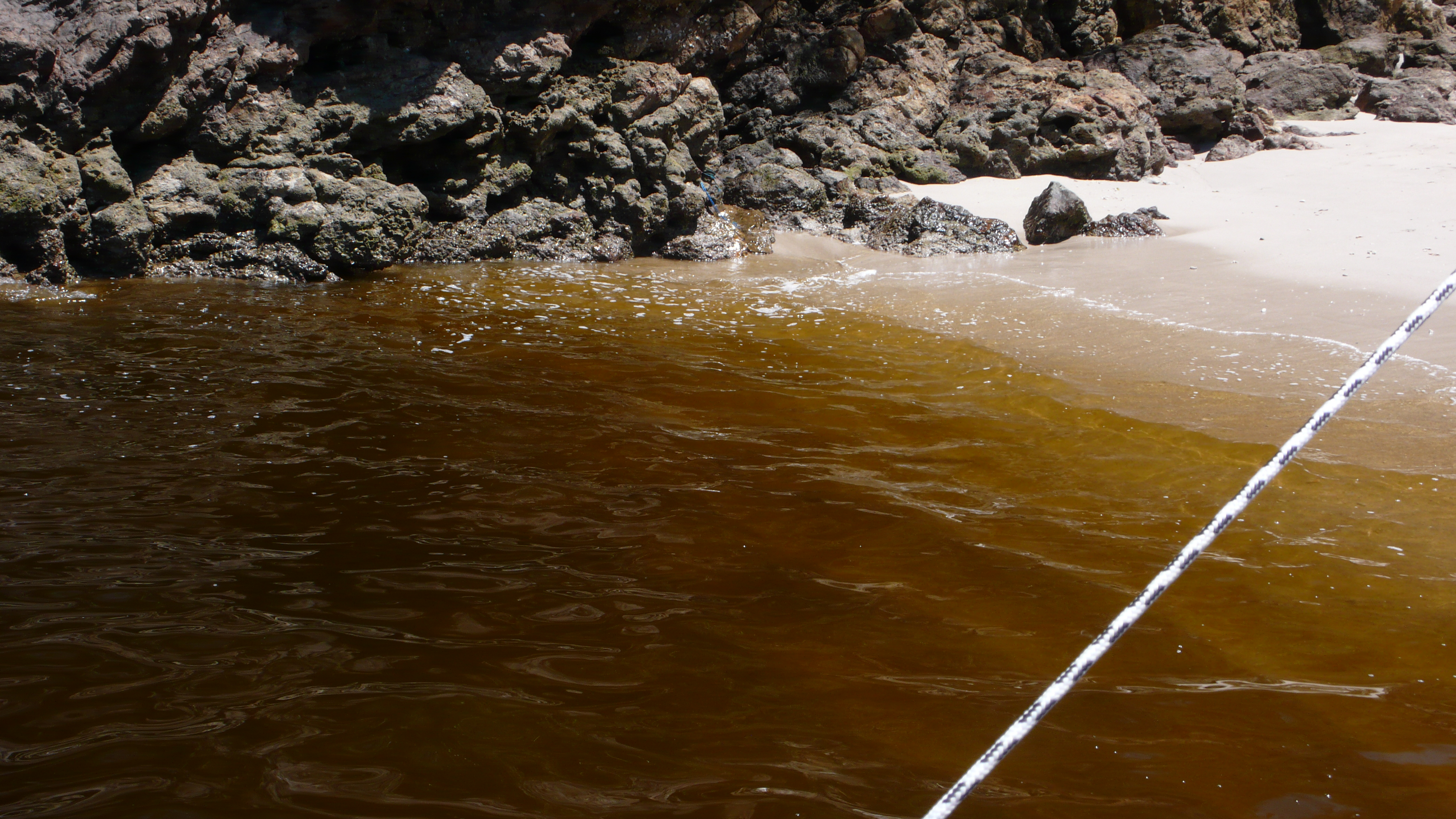 We enter the coves and see other boats, a white sandy beach (usually not that good for shells) some small structures, people swimming – all in all – a mini tourist trap! We drop the chef off at the beach and then head to one of the smaller rocks, as we take a ride around, there had to be 5 other snorkel boats there. Tourists flapping around in the water, was not the prettiest sight. I thought to myself how lame we are, fish voyeurs, flapping around with masks, if I was a fish I would laugh at us. The boat captain takes us around the boat to see if there is a better place and to go when we notice the water looks thick and red. “There is that Red water again, what is that?” I ask.