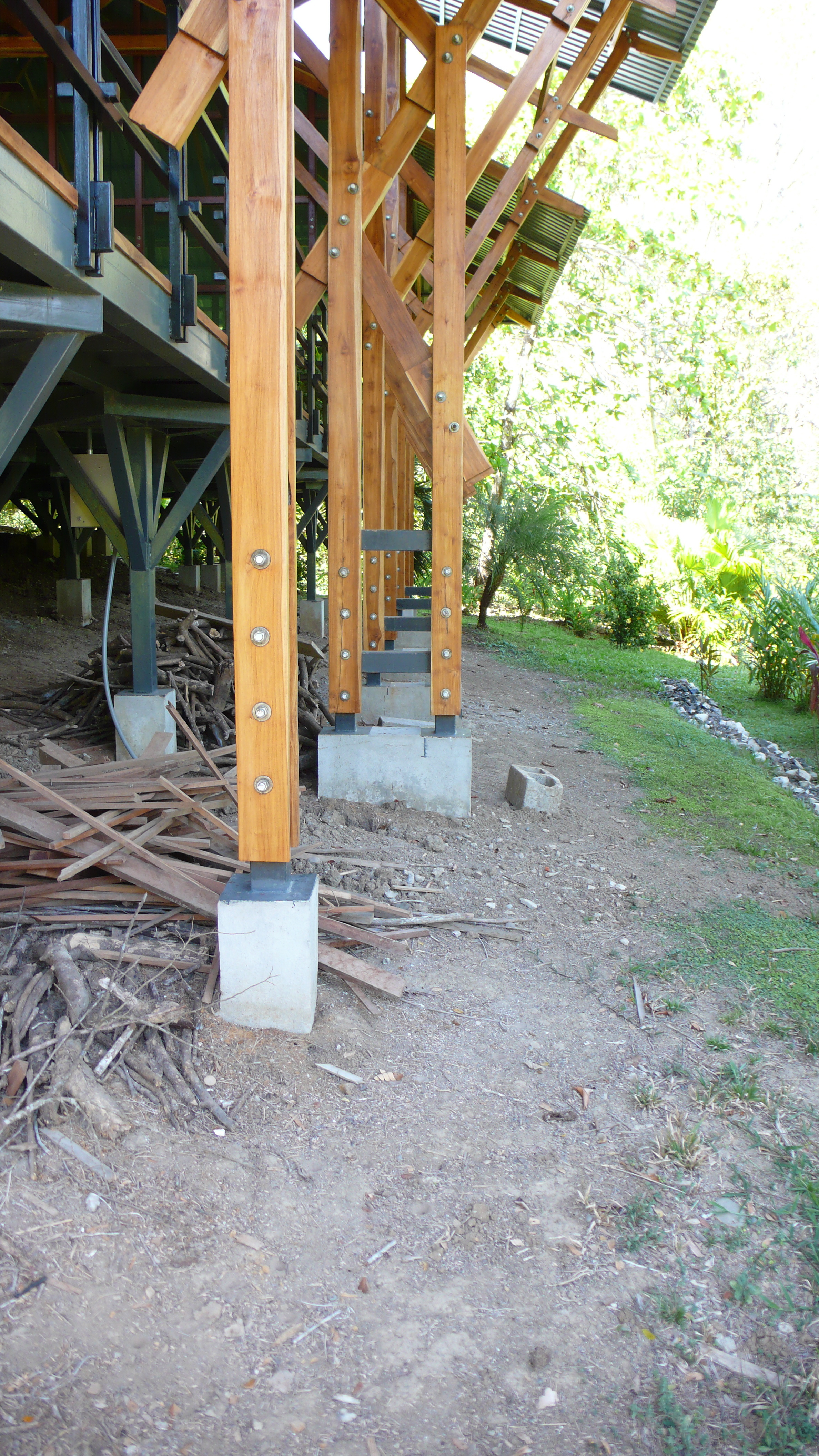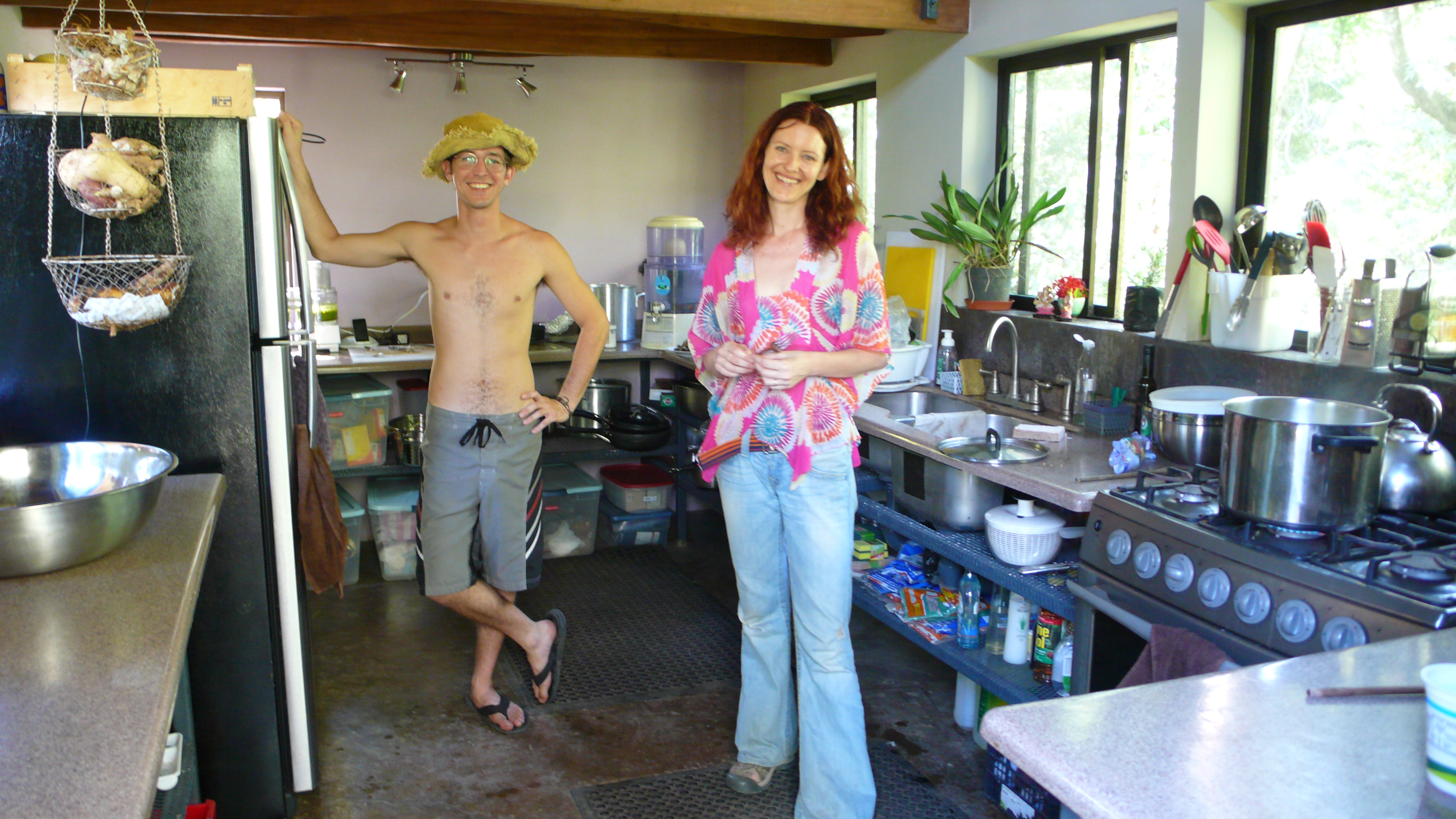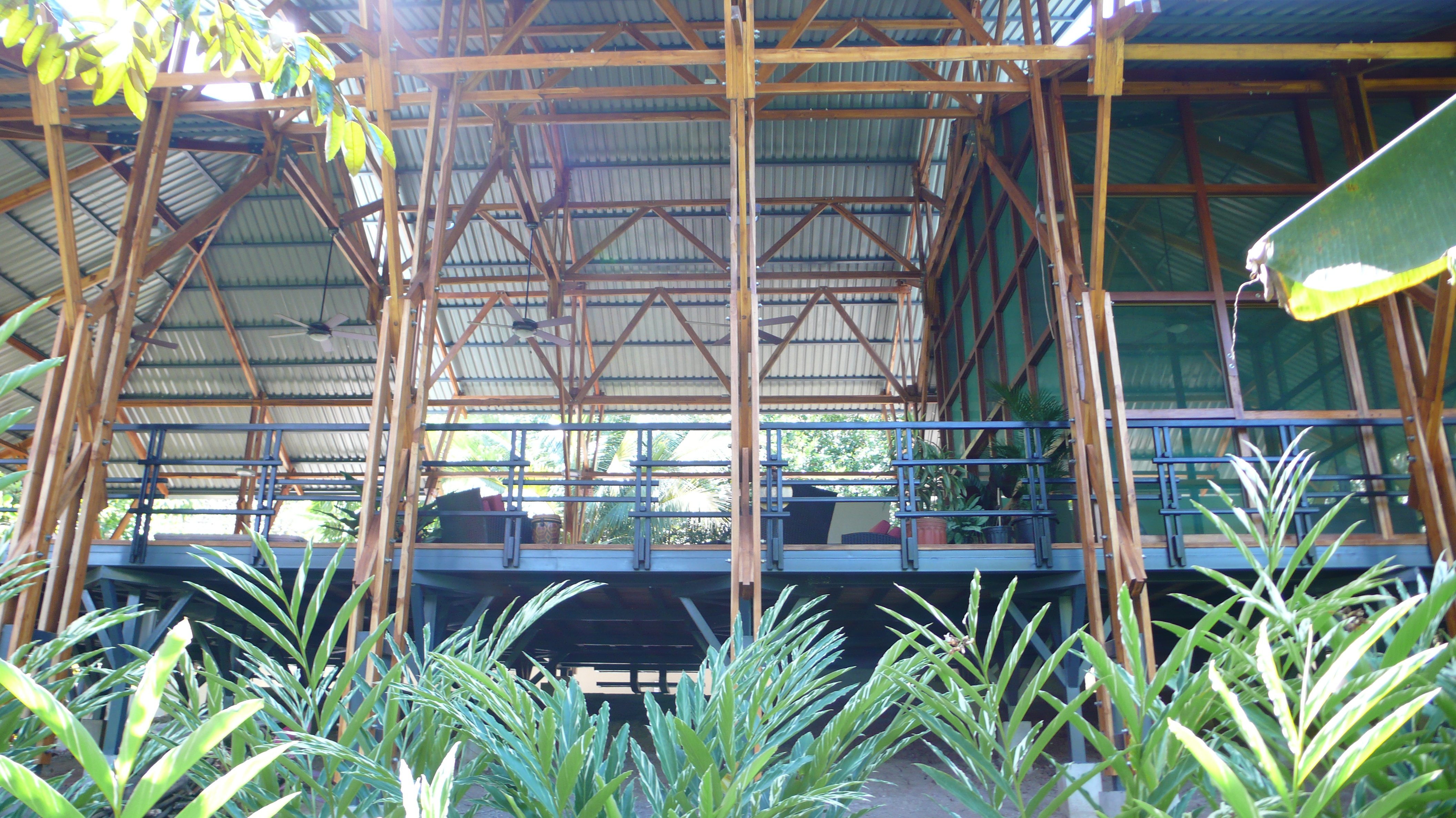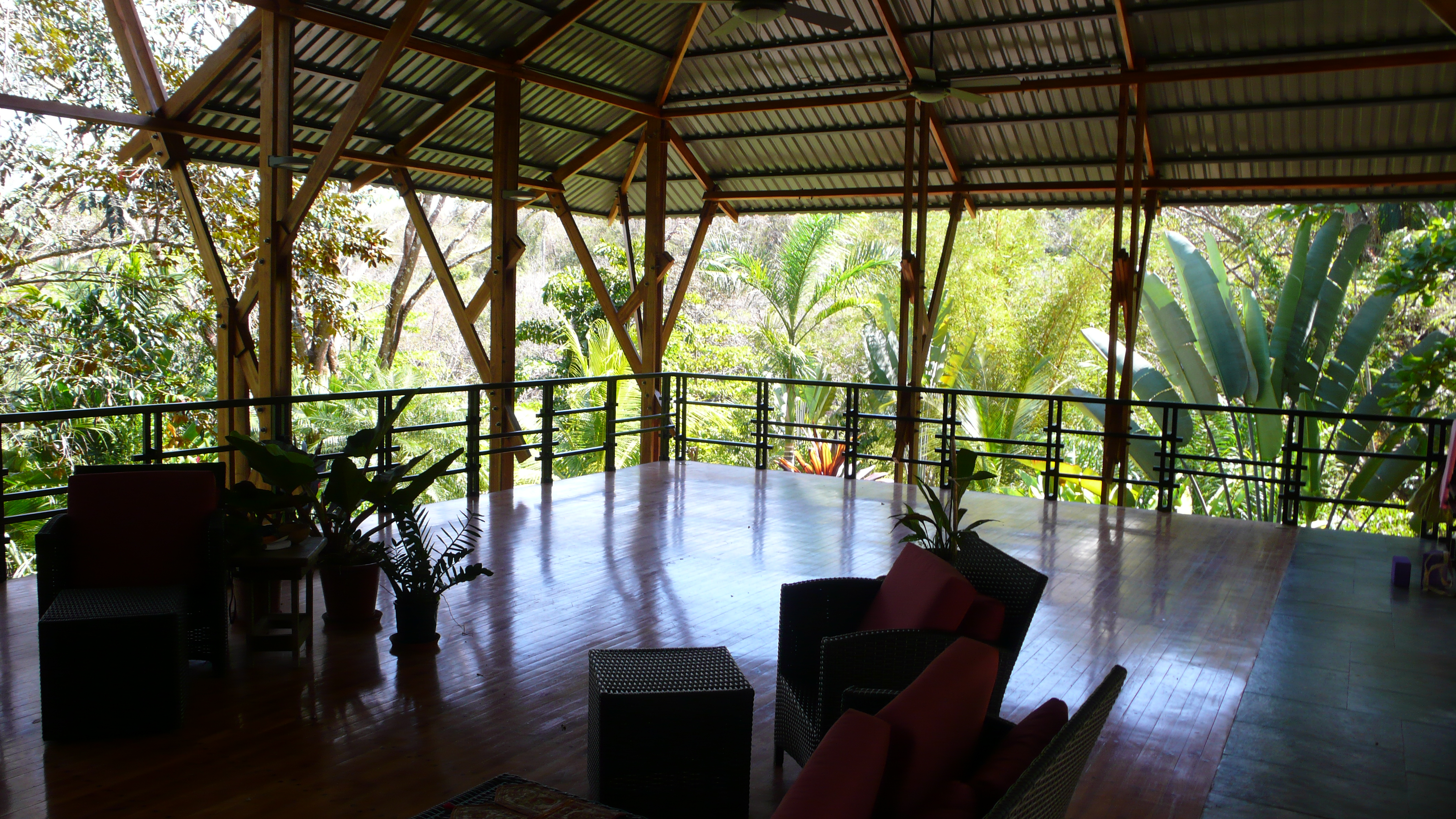 The Sanctuary at Two Rivers is 7 years in the making and Jeff Gossett and Perrey Reeves are the co-creators. As we leave the river behind and start to climb a hill, a fence line begins and I feel like we might be getting close. At this point I am out of breath but full of energy, we find a trail and notice the butterflies around. Lynda tells me, she definitely picked the right place to live. Jeff and Perrey asked her to join them in Costa Rica to fulfill a dream of a Yoga and Meditation Center in the middle of nature. Lynda came on board leaving all of what she built in Los Angeles behind. She is really happy at her new home. We come up to a building on stilts and I smell something good cooking in the kitchen and I am shocked! “WOW!” a real building with a real kitchen!