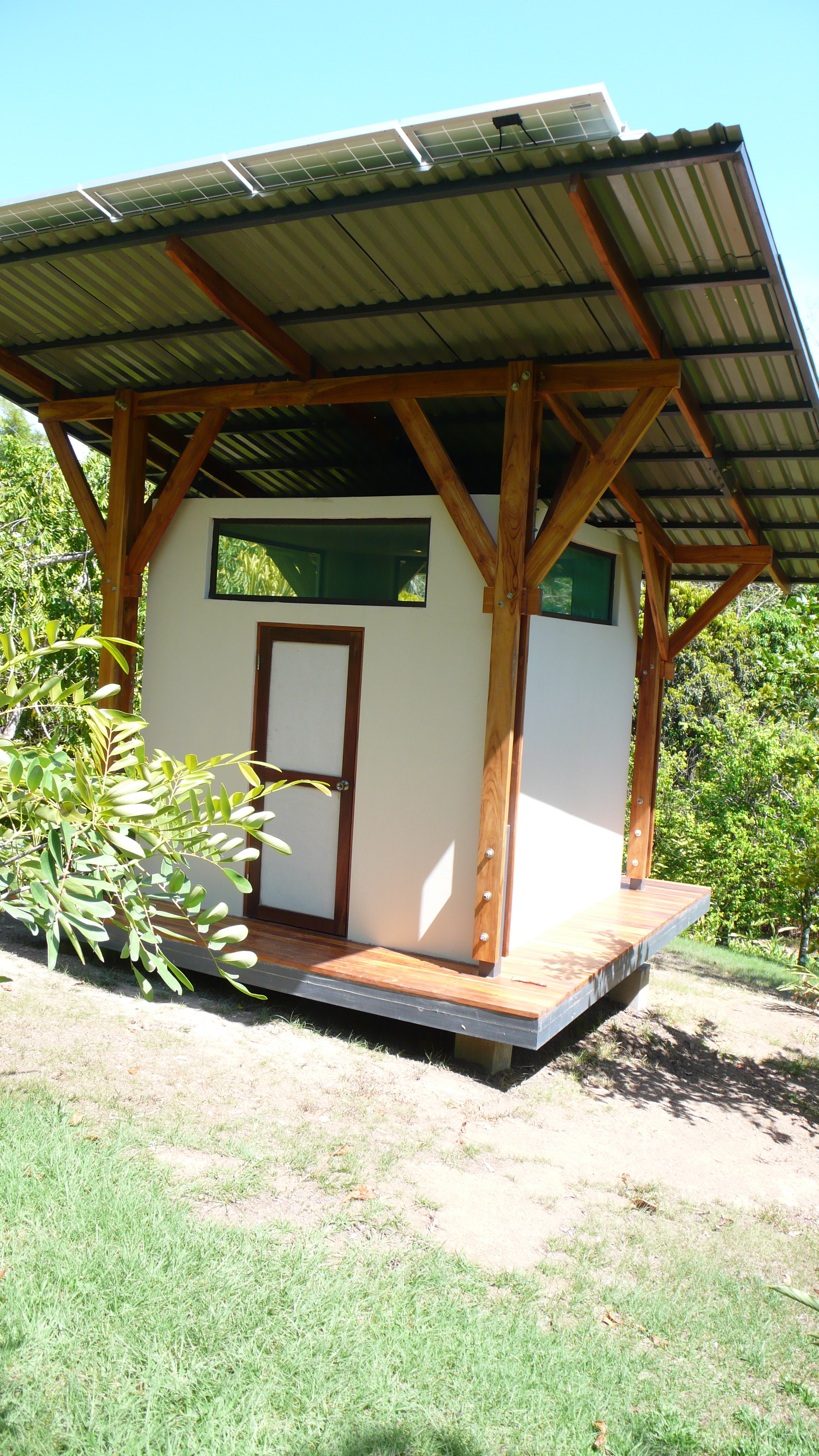 This indoor/outdoor building with a kitchen attached is the communal dining area and a few dogs come out to meet me! Jeff sits on his computer, fans above are at full throttle and there is internet! WHAT? How does that work? After a refreshing glass of Lemon Mint Iced Tea, just delicious, I notice Lynda opening up the packages with excitement. Beautiful books and notes from her Claire. Her face was worth the carrying the books on the plane, the getting lost, and the hiking up this mountain side. I feel happy. After our tea, I am ready for my tour of Lynda’s new home! First stop? We walk over to the building that makes it all happen. The solar power station.