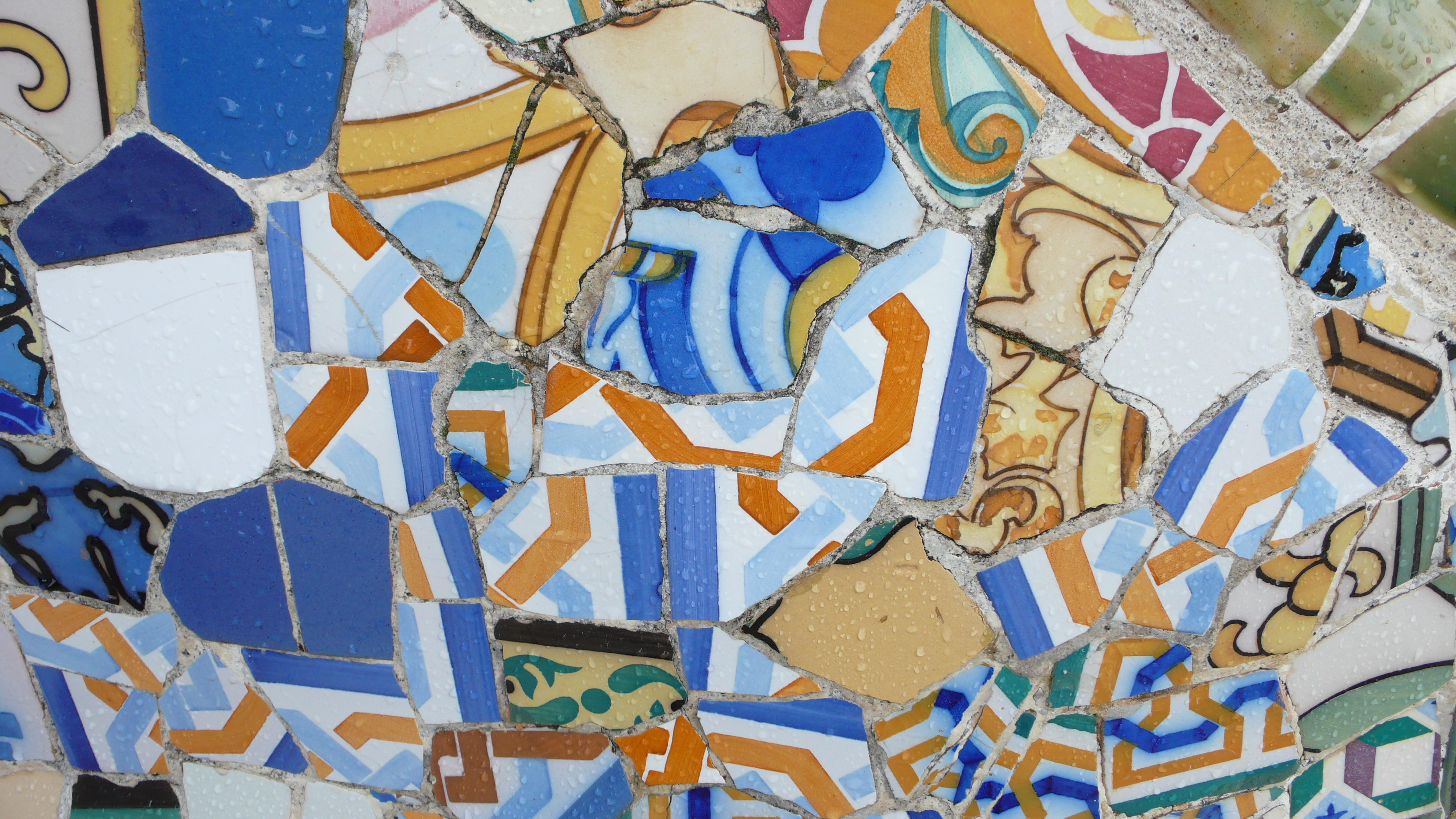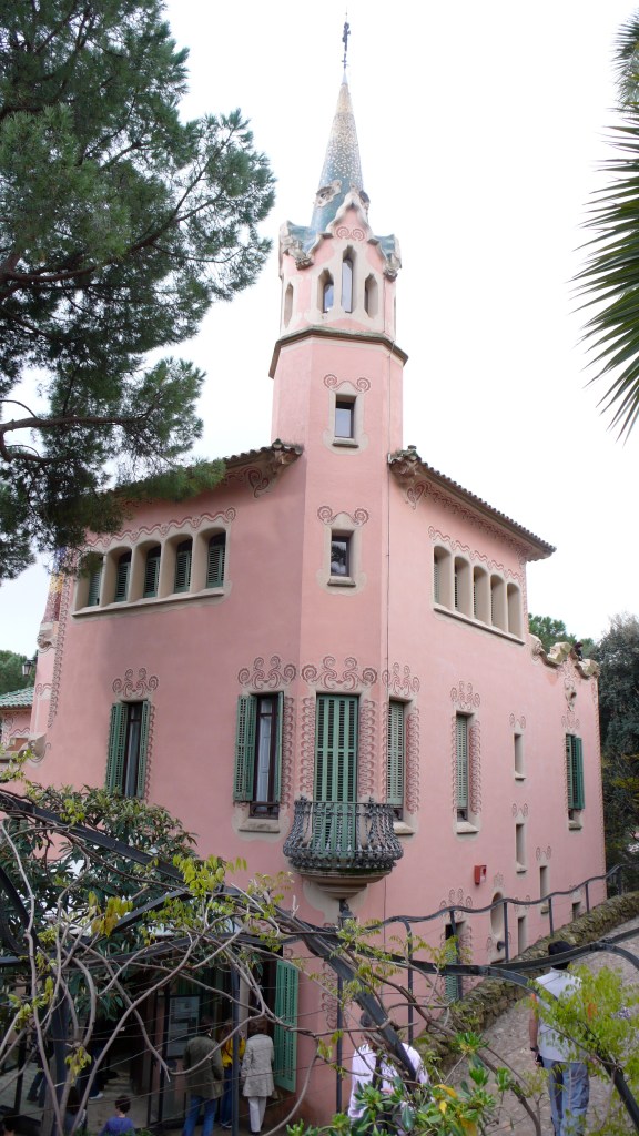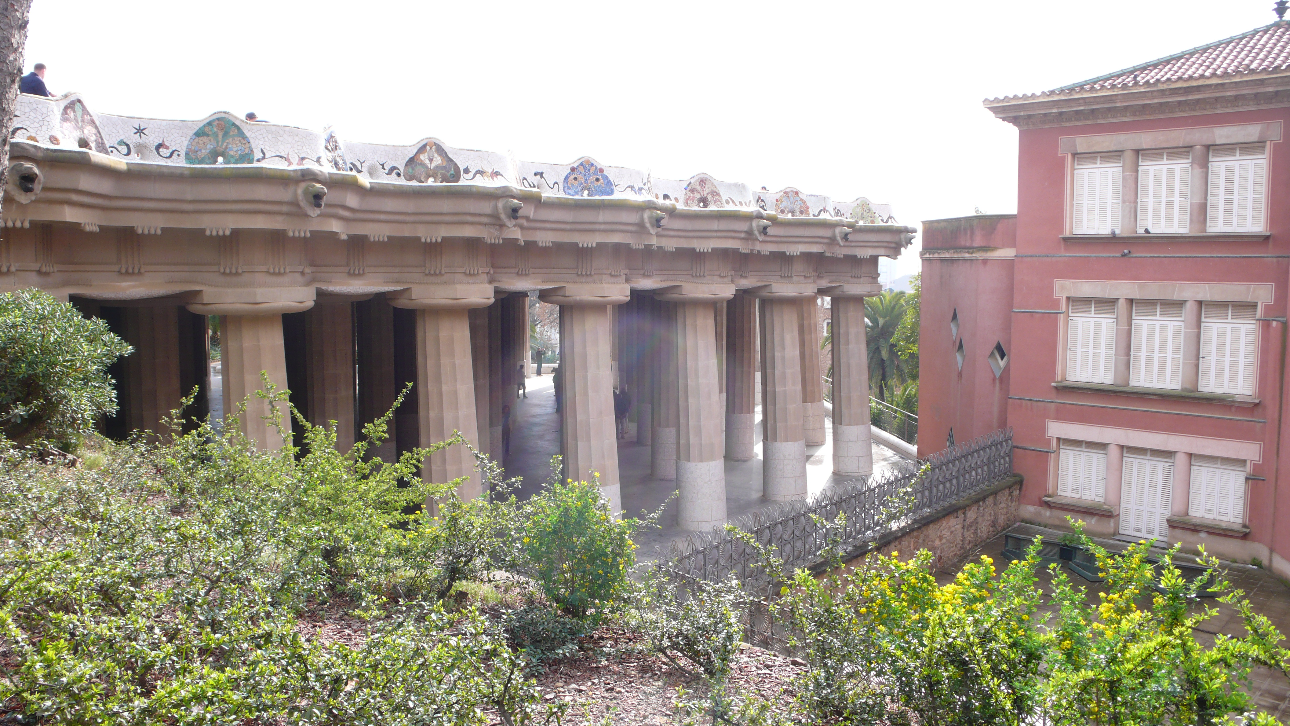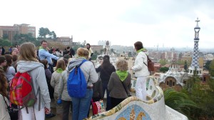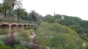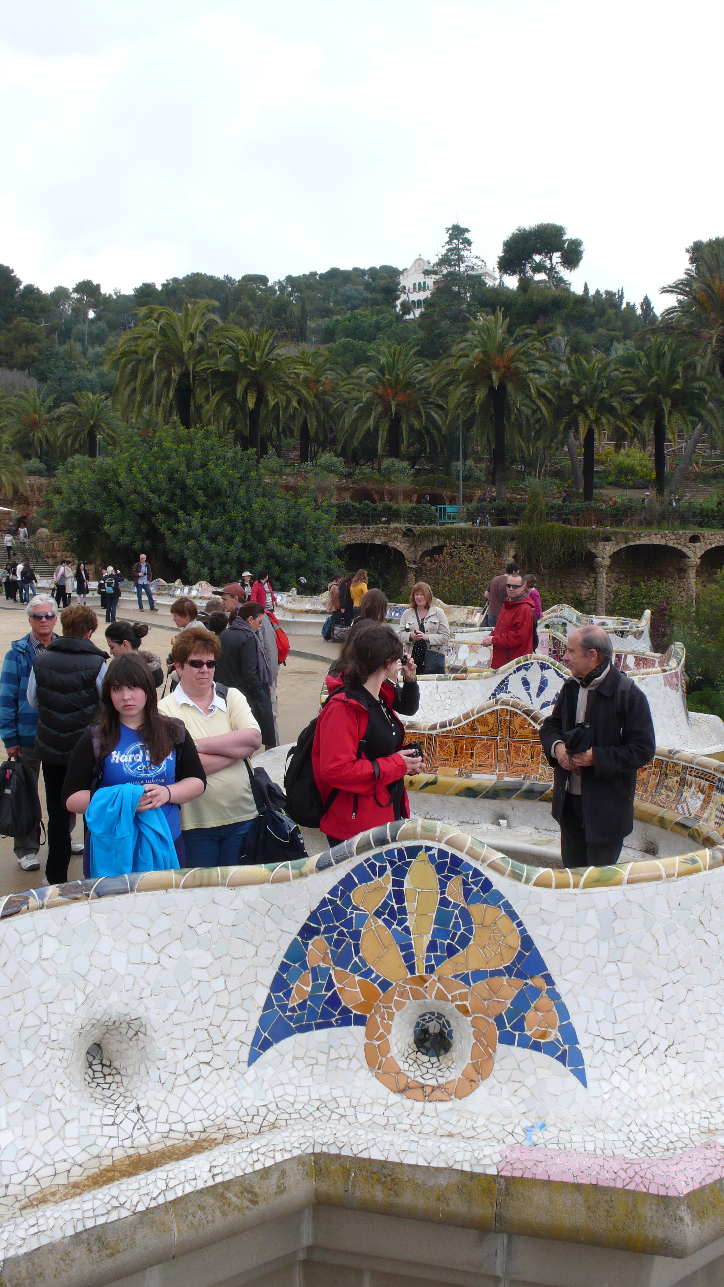 Waking to cloudy skies, we make a note to bring an umbrella… our first stop today is Parc Güell. We hail a taxi and drive through the most beautiful neighborhoods. I decide that Barcelona is a very livable city. The balconies are filled with clay pots of green plants and palms, the awnings of all colors hang over cafe tables of life. It is a shame to me that Balconies in NYC are normally dead with life. In europe the enclaves designed on balconies are normally small pieces of heaven in the sky and I have always admired that. There is a mix of old and new buildings that make up the neighborhoods and as the taxi starts climbing a hill I notice that the streets are SPOTLESS and wonder when in an education system does a human realize their impact on the world around them and how a simple decision of throwing something in a garbage can effect the world around them – then I realize – the Europeans still don’t have a throw away society YET. People take their coffee at the coffee bar – not to go! If you look in a trash bin in NYC it is usually TO go Coffee cups (from starbucks) bottles from soda or water and togo containers. It is kind of depressing! It is Good Friday, a holy day for Catholics and National Holiday. Businesses and Banks are closed but Tourism is huge here and apparently Easter weekend is a popular time for tourists so most everything is open as far as attractions: ie – restaurants, museums and shops so we are in good shape. As the taxi climbs we arrive to the entrance of the park. “What is this? The North Pole? You immediately feel that elves are going to pop out and start dancing! Welcome to Parc Güell. This park was commissioned Eusebi Güell who was interested in building a park for the aristocracy of the area. When commissioning the designer of the park who else but Gaudi was asked to do the job. Gaudi even lived in the park for years in one of the structures that he built here. This park holds specialties like the longest bench in the world and has a series gingerbread structures that transports you to a fairy land! When entering the park we actually look for a ticket booth but the policeman assures us there is no fee. This is a public park for all to enjoy! How lovely!
