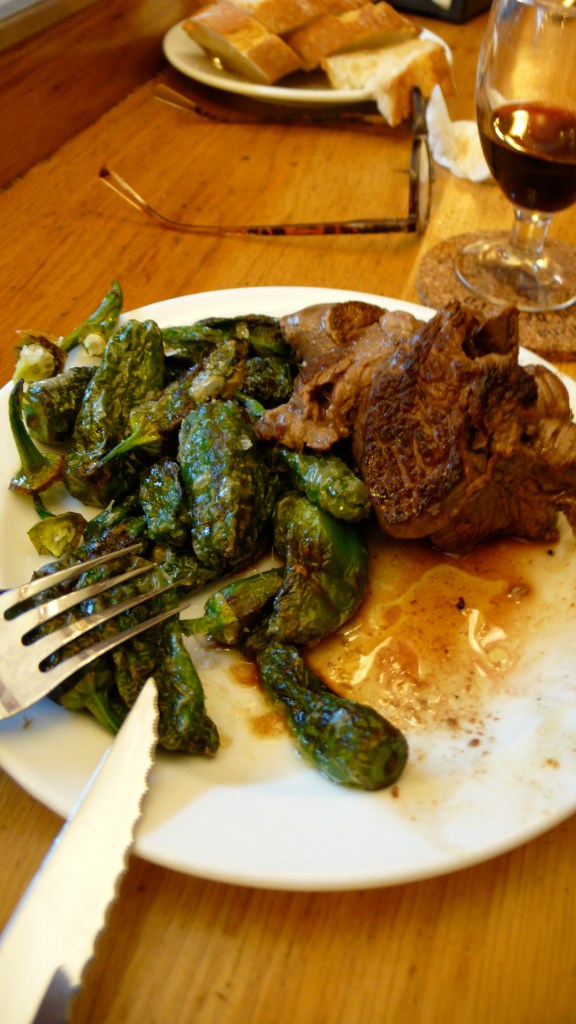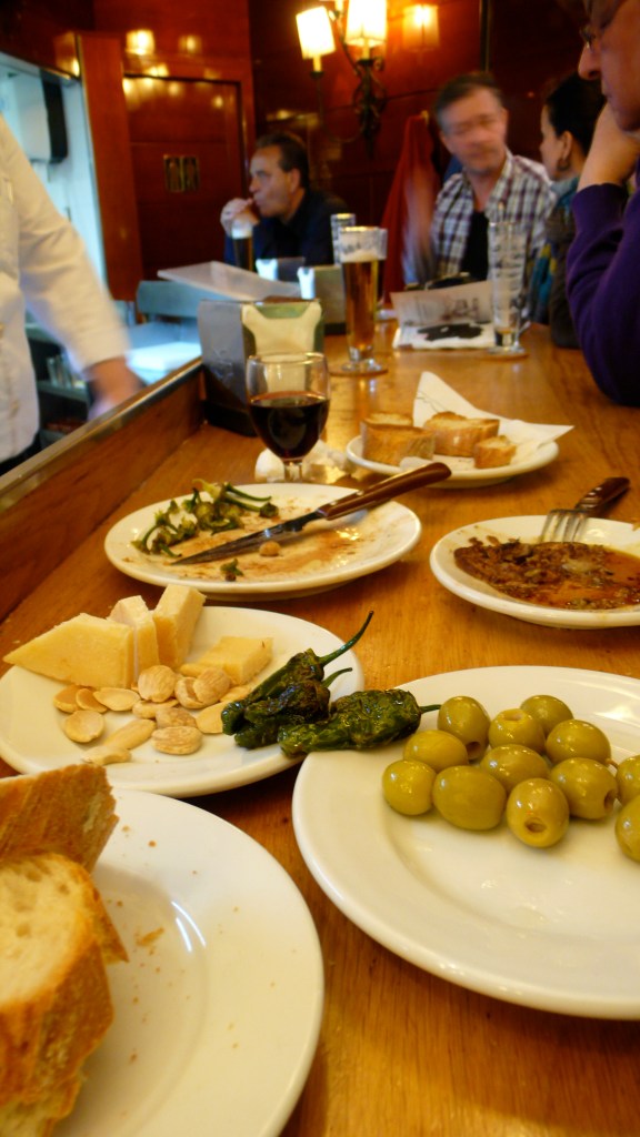The typical white jacketed waiters are quick and if you don’t get your order in within about 10 seconds they move onto another set of customers. We are surrounded by locals and tourists that each have an insatiable appetite for tapas. When we arrive the bar is full, we squeeze into a nook on the side, order 2 Riojas and some starters and wait for a seat at the bar. Within minutes we get 2 spots and just in time for the first tapas to arrive. It is a split between Manuel and me – I wanted the Peppers and He the Solo Meo which is some cut of beef he swears is like nothing you ever tasted. Then the Fois Grois showed up fried with Onions, then the Almonds, fresh bread and Manchego Cheese and the Green olives that have a fresh nuttiness about them. I am realizing that there is not that much to eat if you don’t eat fish, meat, pork or poultry. Still the servings are perfect and the wines keeps flowing!