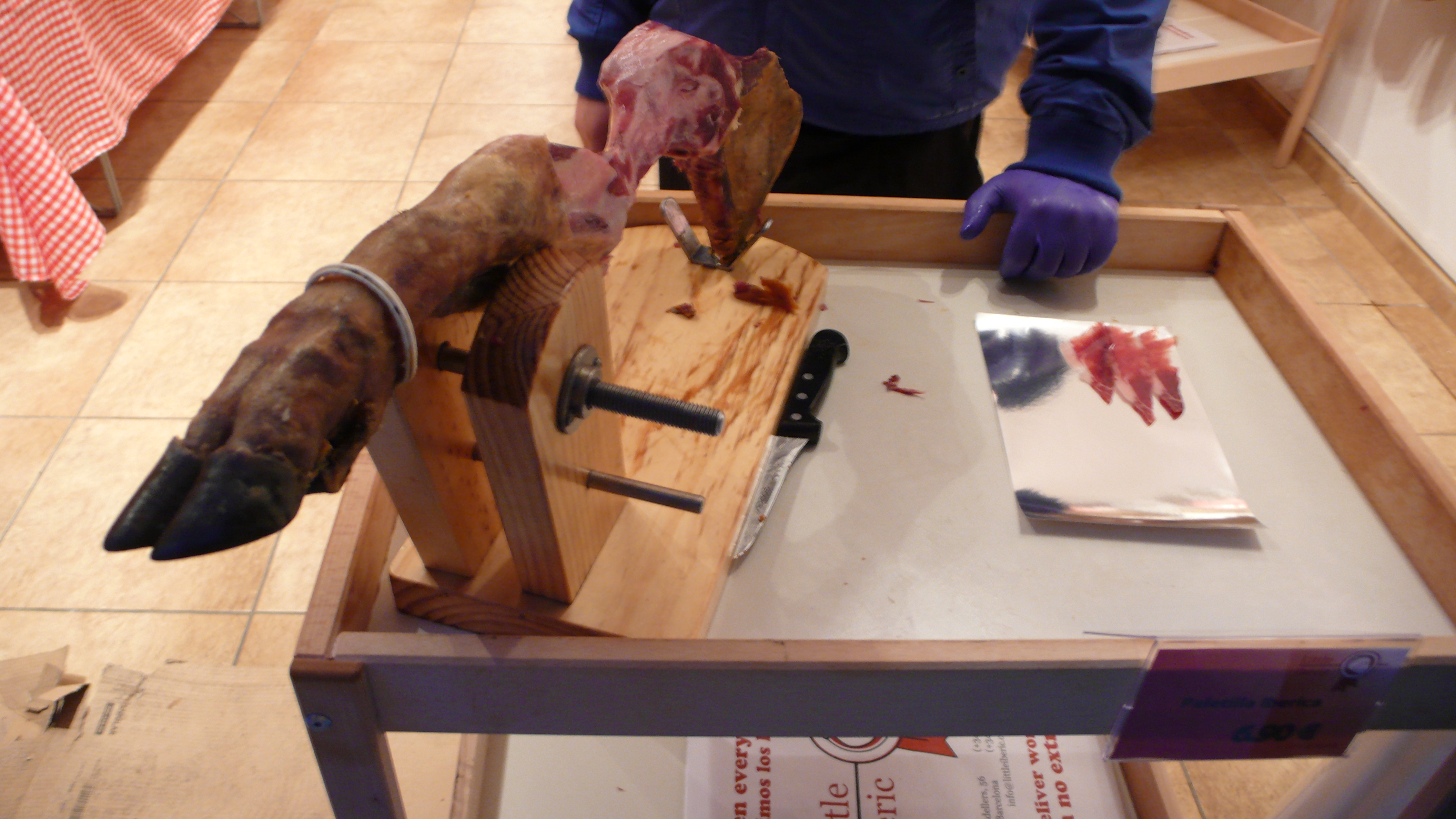 The truth is? I can’t really imagine a Spain without its beloved Jamon. You can’t imagine a Spain without it, because it is literally EVERYWHERE. From the moment you land at the airport those famous legs are hanging in every window. Think of all the curtains that could be hung instead! But seriously, there are stores dedicated to the thin slices of piggy heaven and even special knives to slice it just right and wooden ham holders that angle the leg just right for each cut. These guys cut this ham in thin slices identical to carpaccio. Did I mention that the hoof is always attached to the leg? Oh yeah it is. Those little black feet. I can almost hear the pitter patter of the hooves as they hesitate their way into slaughter, still somehow it is all palatable or acceptable or something like that. I suppose it is more honest if you do show the hoof – after all it is no secret that meat is the muscle of a once living animal right? I told someone that once. I said it just like that actually – “Meat is the muscle of an animal.” The person I told this to, was shocked. I asked them – “What else would it be?” and their response was. “Meat?”