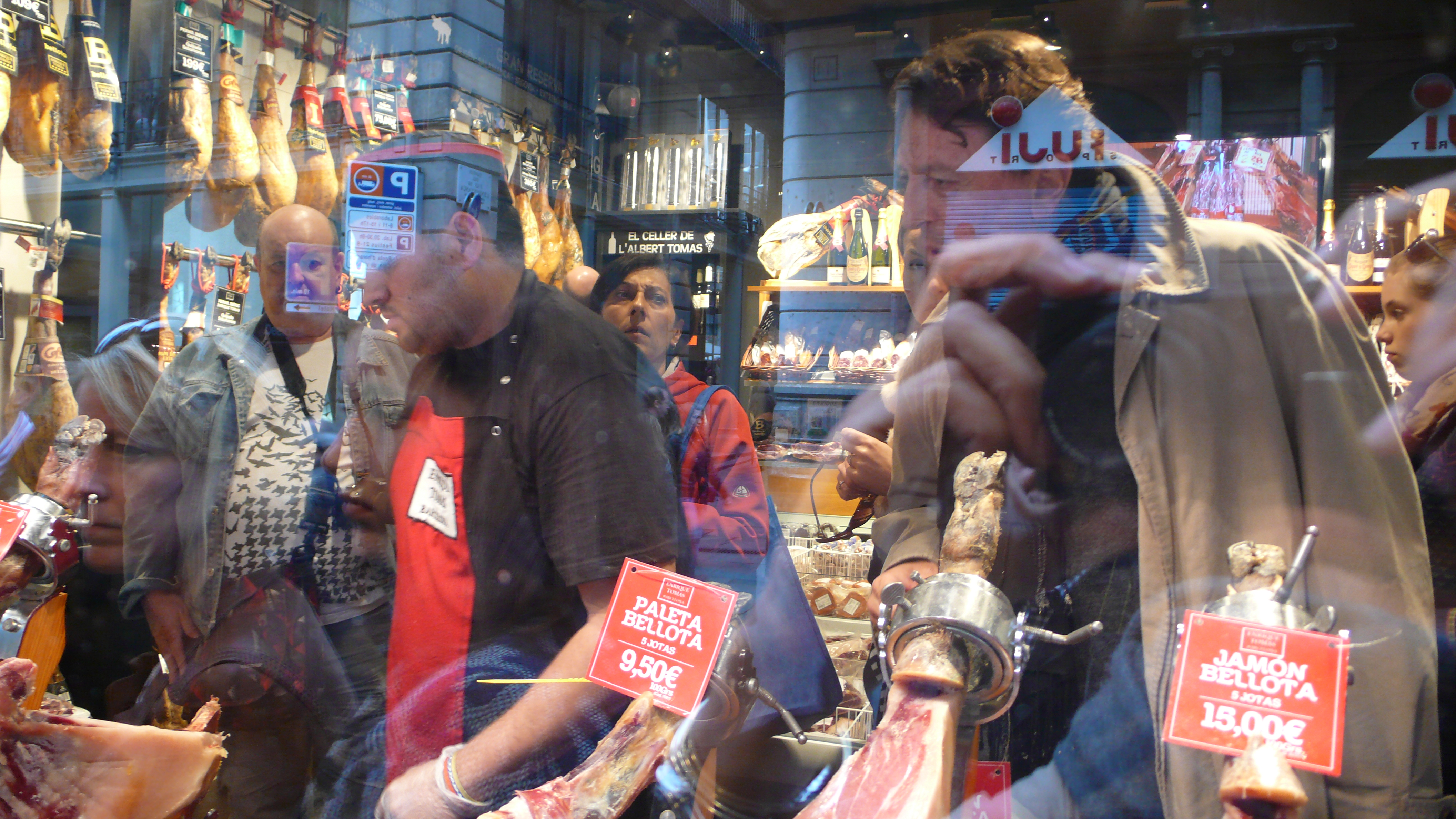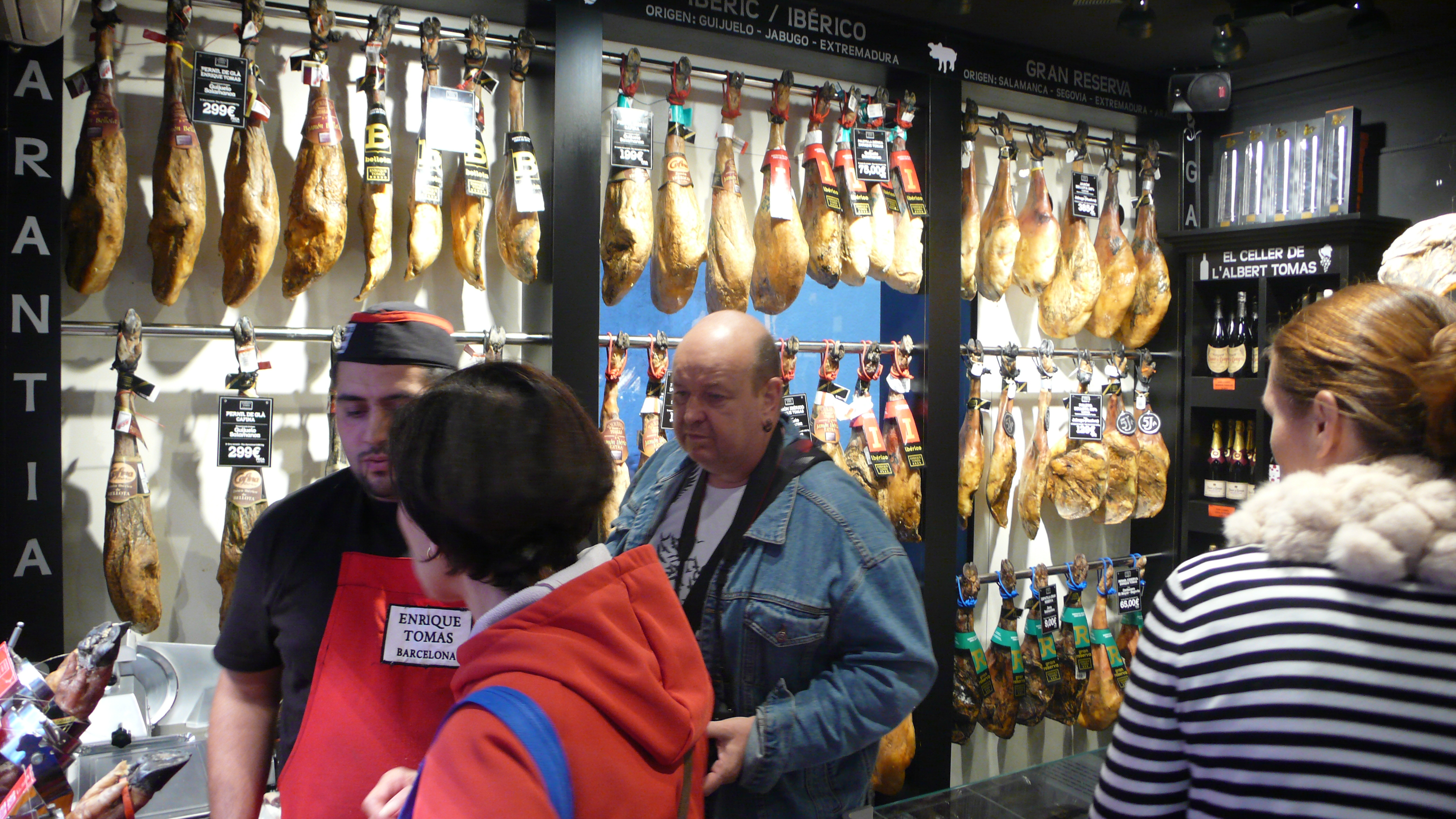 I could go on, but you get the drift in short: The ham is fucking good. The economics of this sliced meat is daunting for a country the size of Spain. Forests are protected so that the acorns can be eaten. Wooden ham holders are produced, knives are invented and so on. Even more interesting is the ham was illegal to bring into the US for decades. The US decided that the spanish slaughterhouses were not up to USDA standards, (probably becuase there was not enough bleach on the premises) and Spain even built factories to meet those standards (which we are know in the US are despicable) for some reason I don’t think it could be worse. Rumors that maybe the slaugher houses in Spain had dirt floors instead of cement or wooden processing chambers instead of stainless steel. Still the new factories were built for US export. I find this a little weird, since hams have it WAYYY better in Spain than in the states. I am going to get to the bottom of this one. Even the fact the Boars graze on about 4 acres of protected land per animal and never go to FEED LOTS is a start! – hardly a factory farm conditions. Anyway, in 2005 the US approved that that years batch would be approved for entry into the US in 2008 and did so. They arrived with the black hoof attached but the US immediatley decided that the feet were unsanitary and insisted that they start arriving with the hoof cut off. So if you do get Iberico ham in the US it is sans the foot. Loses the romance entirely doesn’t it? I would think that the Spanish air in a Spanish city like Barcelona puts the cherry on top of the experience entirely. If you want Iberico Ham, come to friggin Spain.