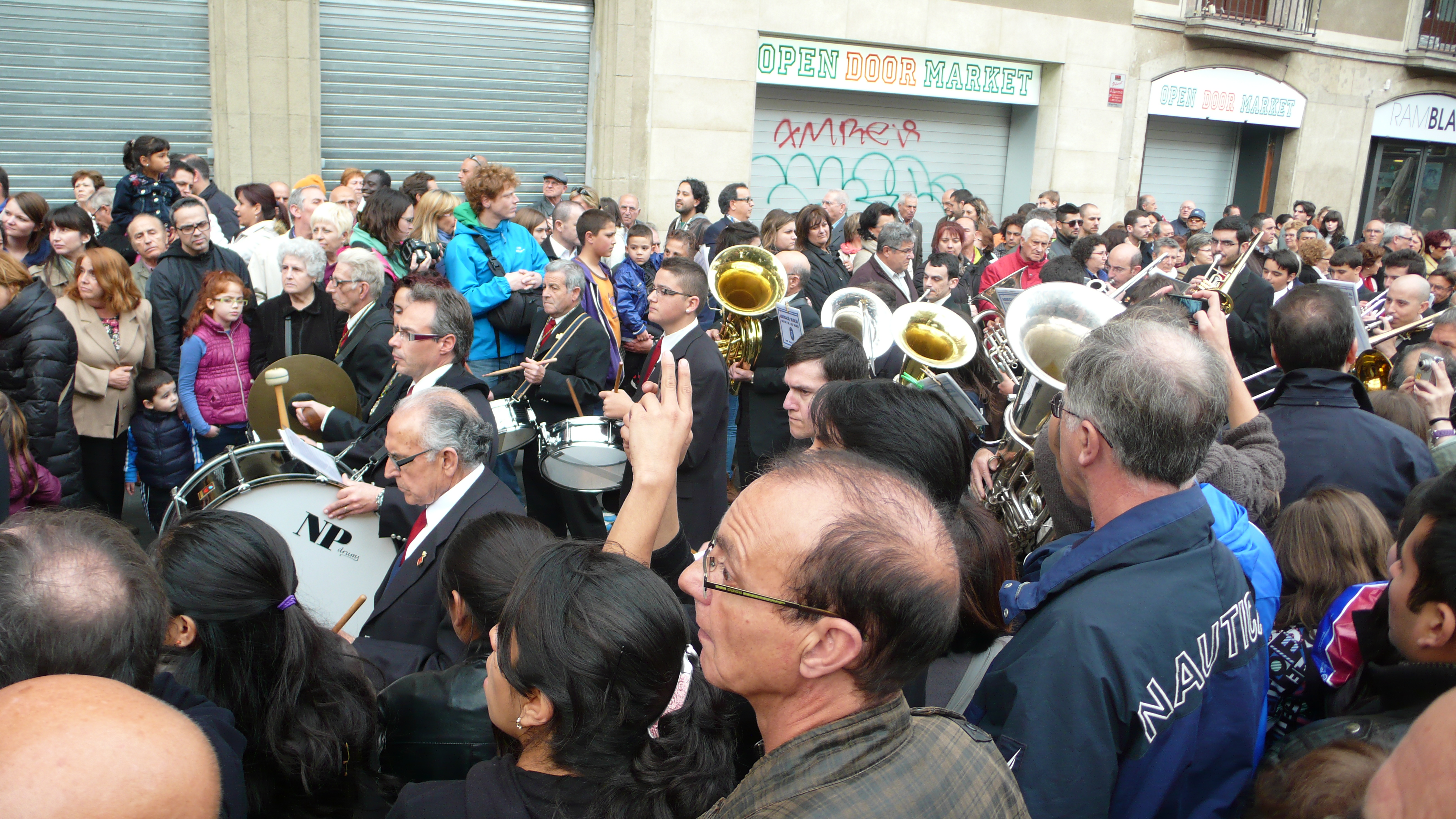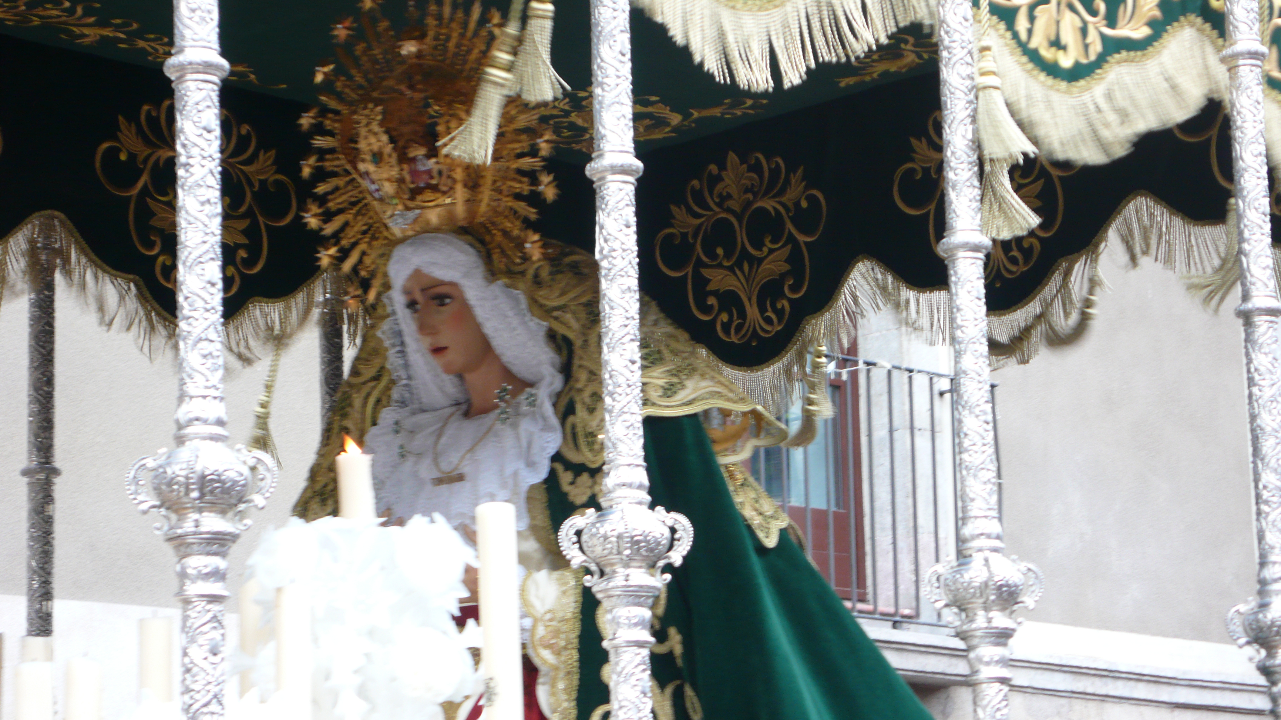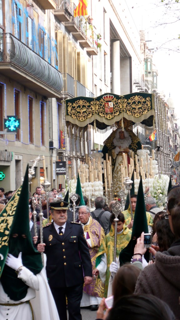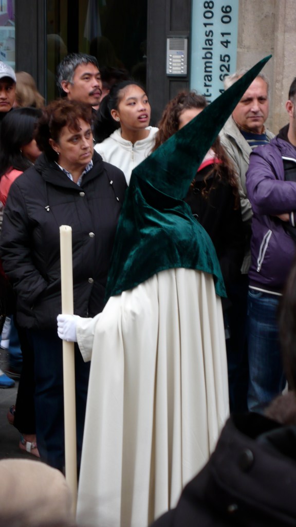 After the cookie purchase we are hit with a huge crowd! Manuel askes what it is all about and it is for the procession of Mary that is hitting the streets. I get excited. I have never really seen this, actually, and in SPAIN? Opus Dey is alive and well here and I am excited for what we are about to see. We zip up our pockets and purses because pick pockets are most certainly on the loose, actually pick pockets in barcelona are the norm and you should ALWAY mind your pockets and bags… ANYWAY – we head toward the Rambla and low and behold! There she was!!! The Virgin Mary. The pious paraders around her were wearing KKK like costumes, ones I have only seen in the movies! Their dark green cone shaped headress/masks were menacing and freaky? I thought, if you are going to be pious, show your face? Why is it in religion that they want everyone to cover up the body that we were given? To hide? To cover? That never made sense to me! Pious people should run around NAKED! and do it in the name of GOD! 🙂 still we stayed and watched. There were processions like these all over town due to it being Good Friday. On the news that night, there was footage of even the most notorious followers that whip themselves into a frenzy emulating Jesus’ walk towards crusifixtion. It is totally insane. I know that if there was a God, he would not ask you to do anything like that. I think he would just really want you to be kind to one another. This example of rightish religion in the end in my opinion is alienating. Religion more and more as I have travelled causes more trouble than peace and it starts to make me a little angry. I picture myself stomping the procession and pulling the hats off the cowards that pretend to be something else. Instead I let them be. I am passionate but not THAT dramatic! + I have not had my SANGRIA yet! We all waited with bated breath and then the music of the marching band began. The float began to shake, backwards and forwards, candles would go out and reignite and the procession began. It was a strange sight. Here are a few pics!