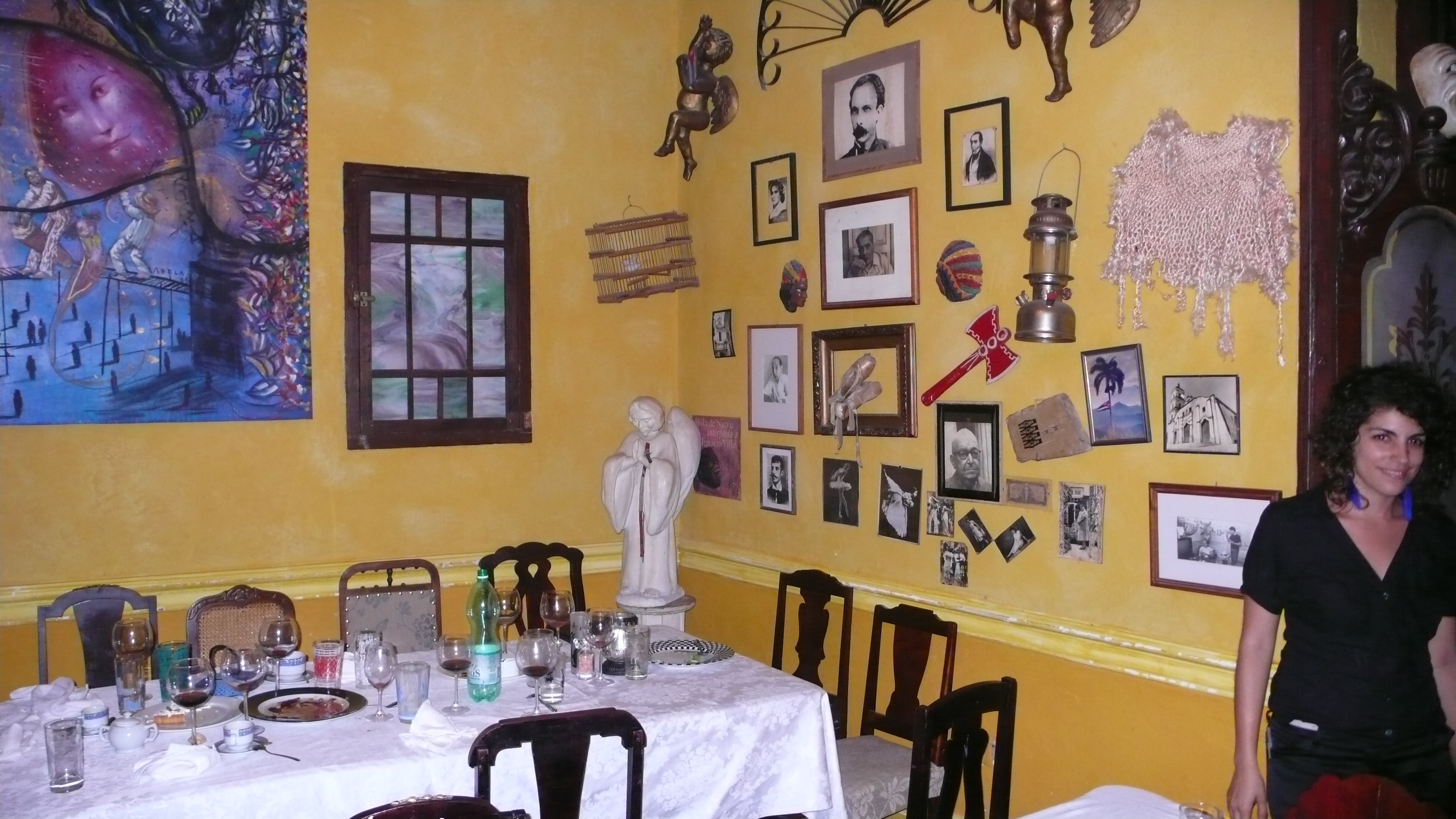This place is well – simple – beautiful. The Cuban tile on the floor, the gold walls and the history in between. We drink out of glasses from the 50’s east with forks from the 40’s. The table cloth is lace from the 30’s and the pictures on the wall, centuries. I would say that this Palador is the pride of Havana which is why they have a few more seat than what is leagallly allowed. Remember when I say – you learn one rule and it is broken around the corner. In Cuba, you have the black market, the grey market, the government run market. Then there is the cash market, the peso market and then the international tourism market. Rules break at moments when they are made. Even thought they call this a faimly run restaurant, it is a well oiled machine. The Servers are beautiful women in black dresses. They are well educated. The wine list is international, the menu is a combination of French, Italian and Cuban and they even wrote “infused” in one of the examples of the dishes. There are tourists in the joint and we have with us, 2 Cuban artists. This might sound strange, but they were all cleaned up and using both a fork and a knife when eating. They ordered the most expensive dishes and one of the artists decided it was too spicy. I can’t decide if this was the truth, they had been there before or this was their first time. The artists happen to be a couple, but I felt them to be unapproachable. You ask questions and they quickly reach a dead end. Cubans in general don’t talk much about important stuff. Politics, America and the things that we would really want to ask about. There is a shrewd unspoken rule that you feel that if you ask. “HOW DO YOU FEEL ABOUT BEING IN THE FREAKING PLACE!!!!” that you might not get a straight answer anyway.