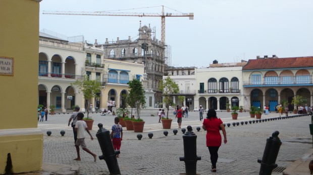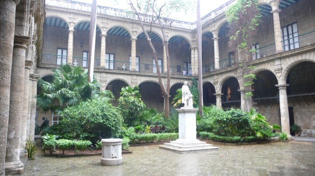 Still somehow you then realize, well there is a crane – a crane operator and workers? So that must be good for the people of Cuba. Wages however are regulated. I don’t know if these guys get the same as a baker or not. I never found out. Walking through we get caught in a rain storm. There is nothing better than a tropical rain to cool you down on a hot day. We take cover in an art gallery that has the most beautiful courtyard and we are hung up there for about 45 minutes. It is here that I am able to buy post cards and by a commi newspaper to see what they are talking about. The Pope just visited so the headline was “The POPE SHUNS THE US FOR THE EMBARGO”. The other headlines are “CUBA HELPS LIVESTOCK FARMERS PRESERVE LAND.” Another is “DOCTORS SENT TO ABU DABI TO PERFORM SURGERIES!” What I notice about the papers is that there are very few ads. I also notice that they are very anti american. “America stops this! America stops that! Finally there is an article that Cuba is starting a 120 year old club. That Cubans are so healthy that they should all live to 120 years! I second think the socialized medical and wonder – maybe it is that good? The tour group cruised around and braved the rain by the end. We were really hungry and wanted to get to lunch so we started walking toward the Palador. The magic of the rain on the streets and the cool air and the sounds of the city were beautiful. Here are a few things we saw along the way to lunch.