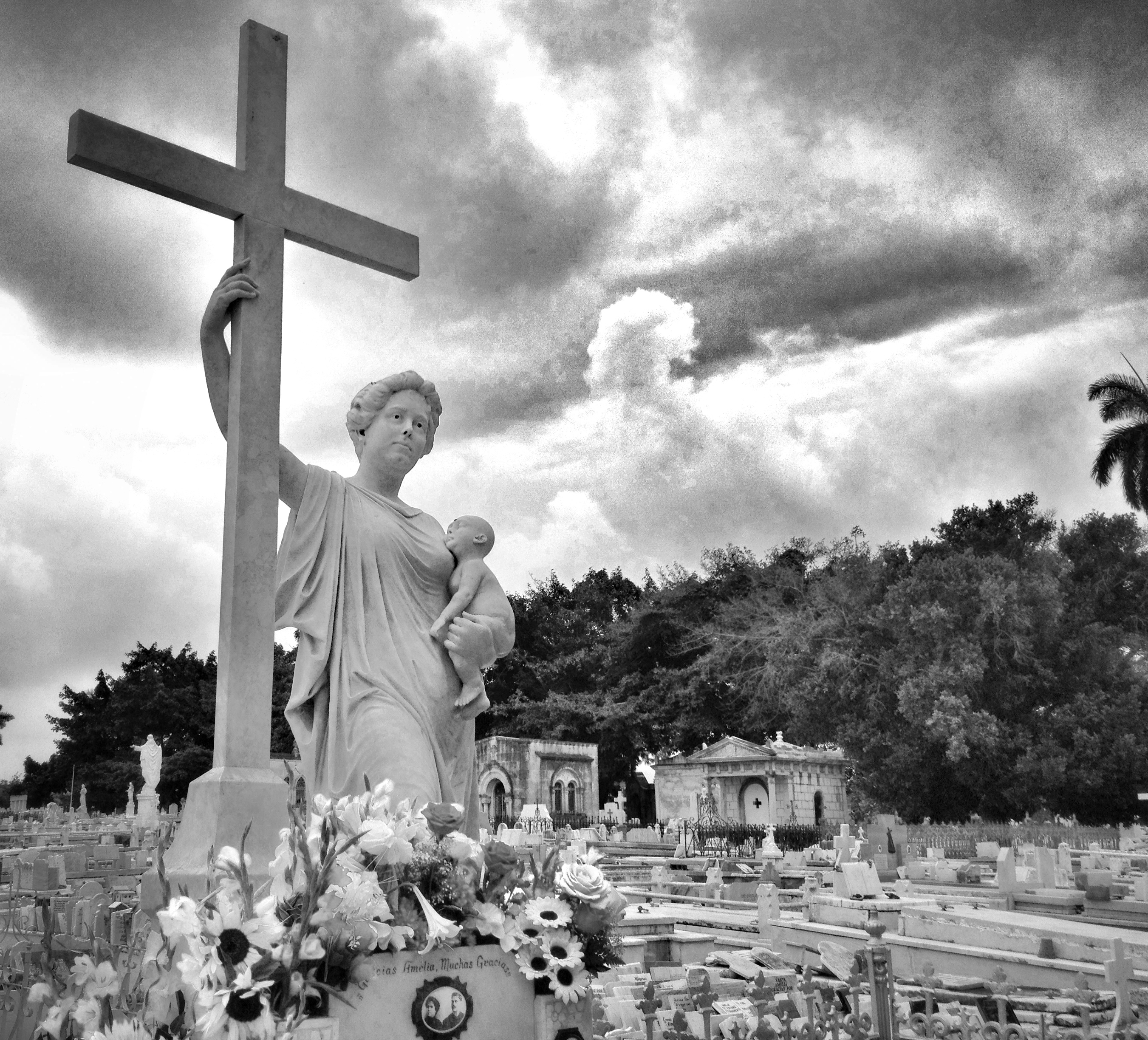 There are no “TO GO” cups at the Hotel Bar, as I beg for my Coffee and Sandwich before I board the Tour Bus. I decide to cut open a plastic bottle and it works! Happy as a clam, we start our tour of the city. Within minutes, we realize our tour guide is a total commy. Still he points to his city proudly, and I am always out of sync with the guy. Where he sees a renovated building I see 50 crumbling ones. Where he shows us the upper class neighborhood of Miramar, I see a battered version of the Rhodes in downtown Miami. When he shows us something to the left, it seems I am more interested with what is on our right. Still we struggle through the tour and make our first stop at the cemetery, which reminds me of one you might find in New Orleans. Here you see people polishing decadent burials of Marble and gold and where we find our Amelia. A local saint whose miracle is that she died at childbirth. At her burial, he child was place at her feet but 5 years later, when they removed the top of the tomb. The baby was lying in her arms… A MIRACLE! It is the only gravesite that has fresh flowers placed every day by locals. You can also make a wish and Amelia might grant it. I somehow forgot to make one, but considering what I have seen so far, I think there is nothing to wish for, my life seems pretty good. My secret wish is that she grants all wishes to Cubans who need and want something.