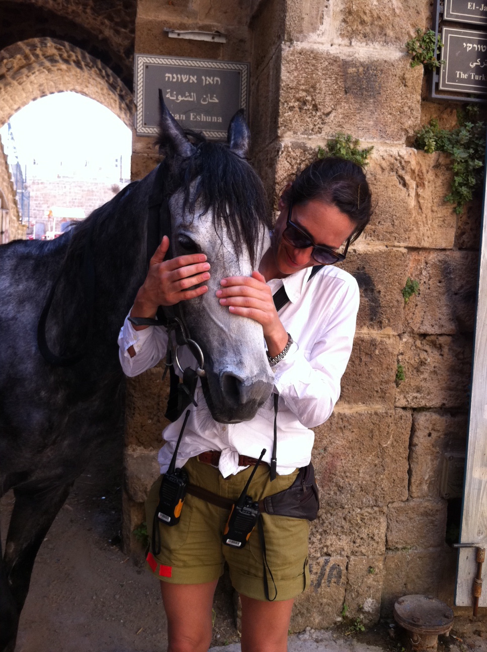 This horse I met while shooting a commercial in Israel. She was ridden by a selfish young boy, probably about 12 or 13. It was so hot that day and the boy kept riding the horse up and down stairs in the old part of town… The horse seemed wired and was hot and bothered. I walked up to the boy and ordered him to dismount the horse and I got the horse some water… She took it happily. Then as I am normally Allergic to horses and need to take an allergy pill, for some reason, this horse nudged right up to me and put her head in my arms and I did not itch once… She stayed there for a few minutes while I pet her… I did not want to let her go. I asked the translator to tell the boys, that we are only as good as we are by the level at which we respect our animals… that they should slow down and be nicer… They claimed they would be but I doubted there insincere looks… I am sure they thought I was nuts…